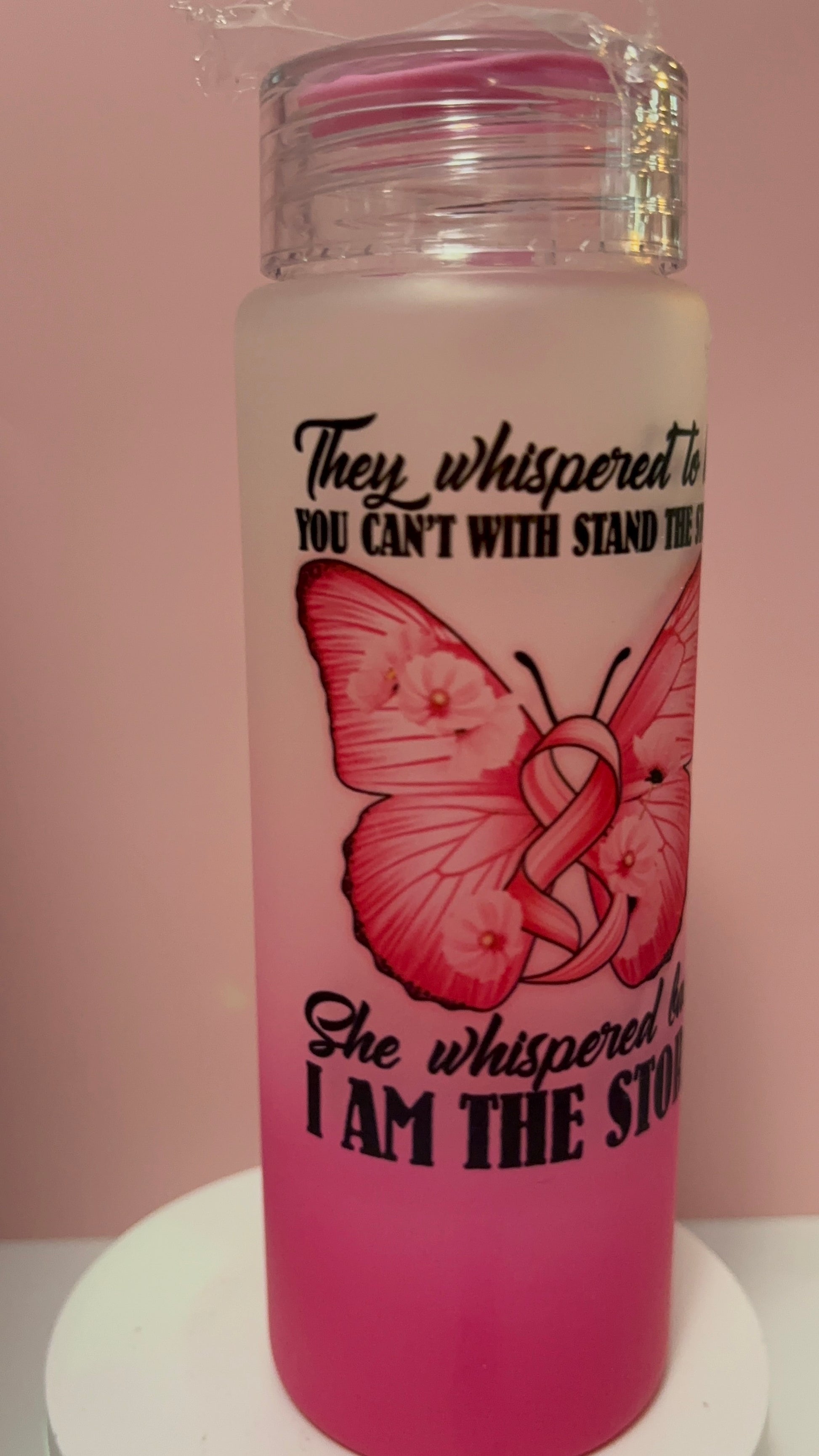 The design showcases a pink butterfly intertwined with the breast cancer awareness ribbon, symbolizing hope, survival, and unshakable confidence.