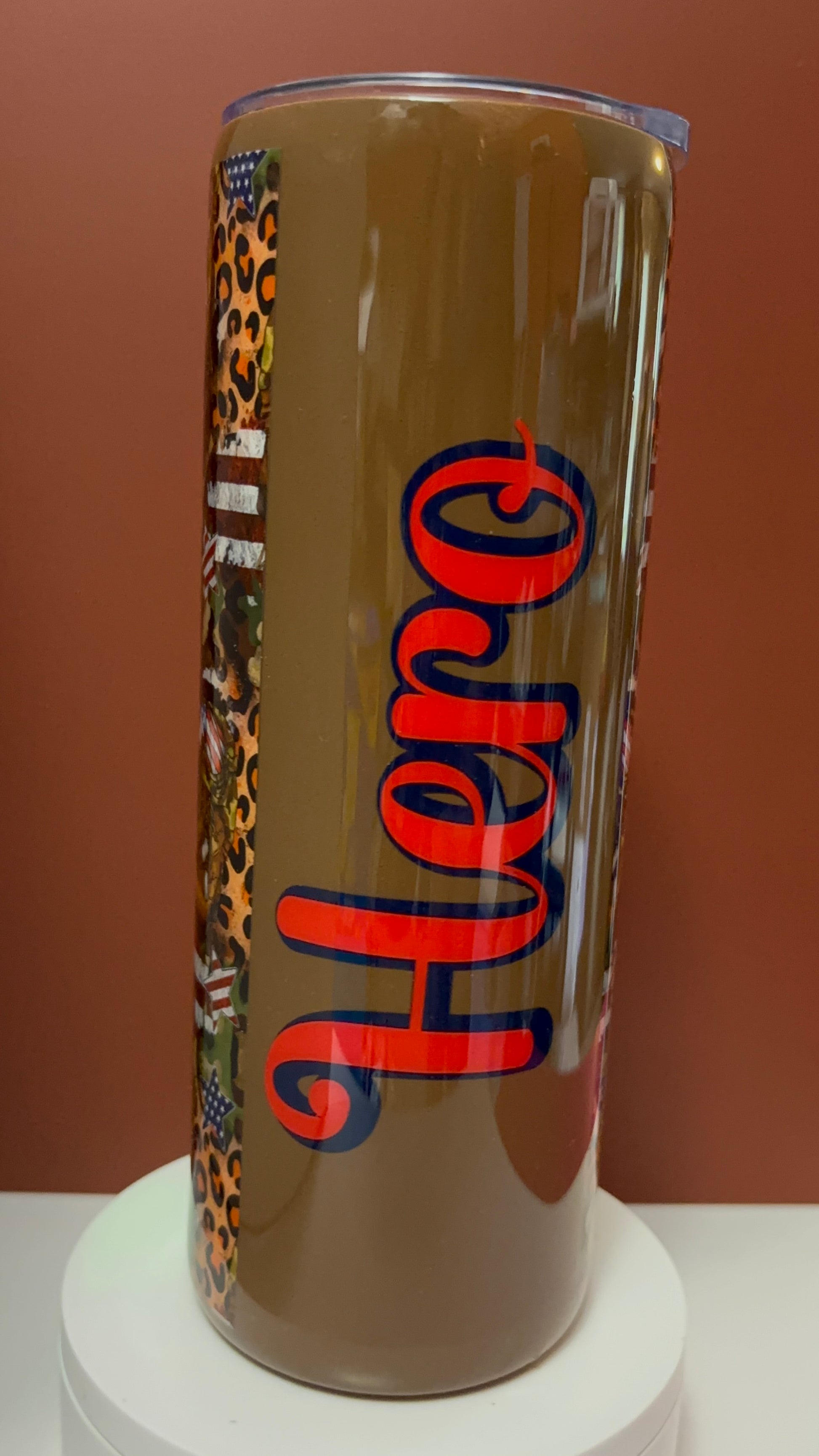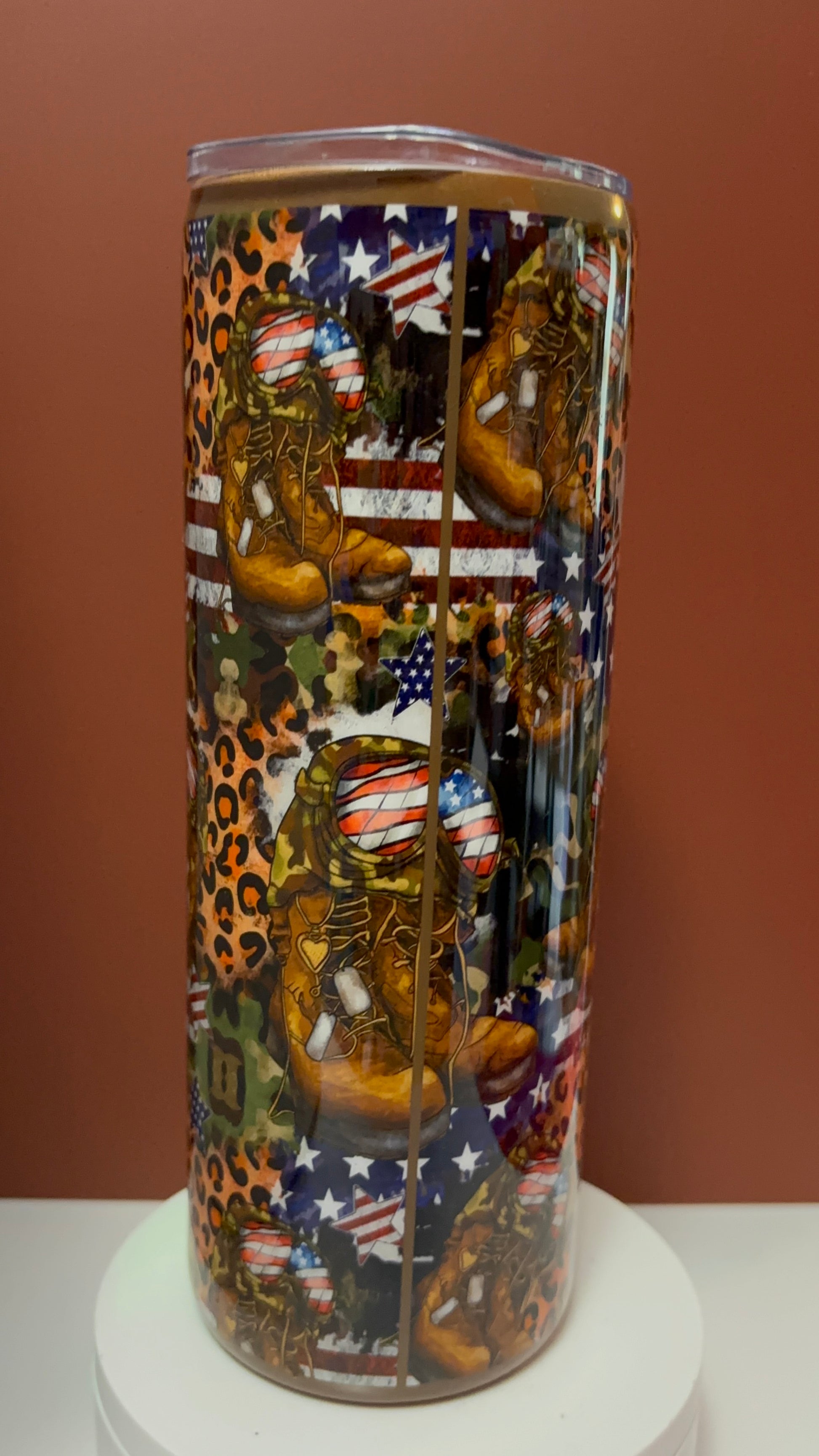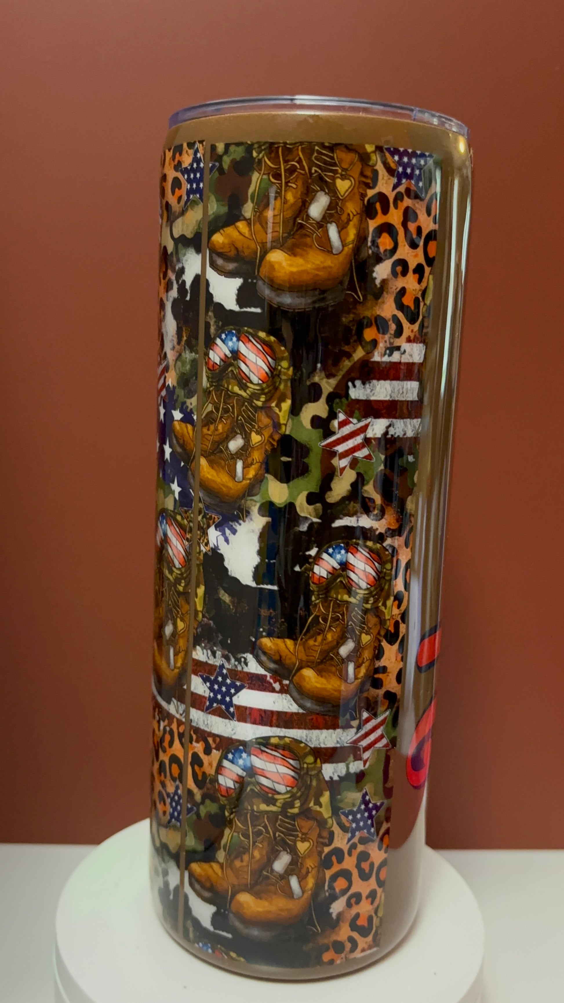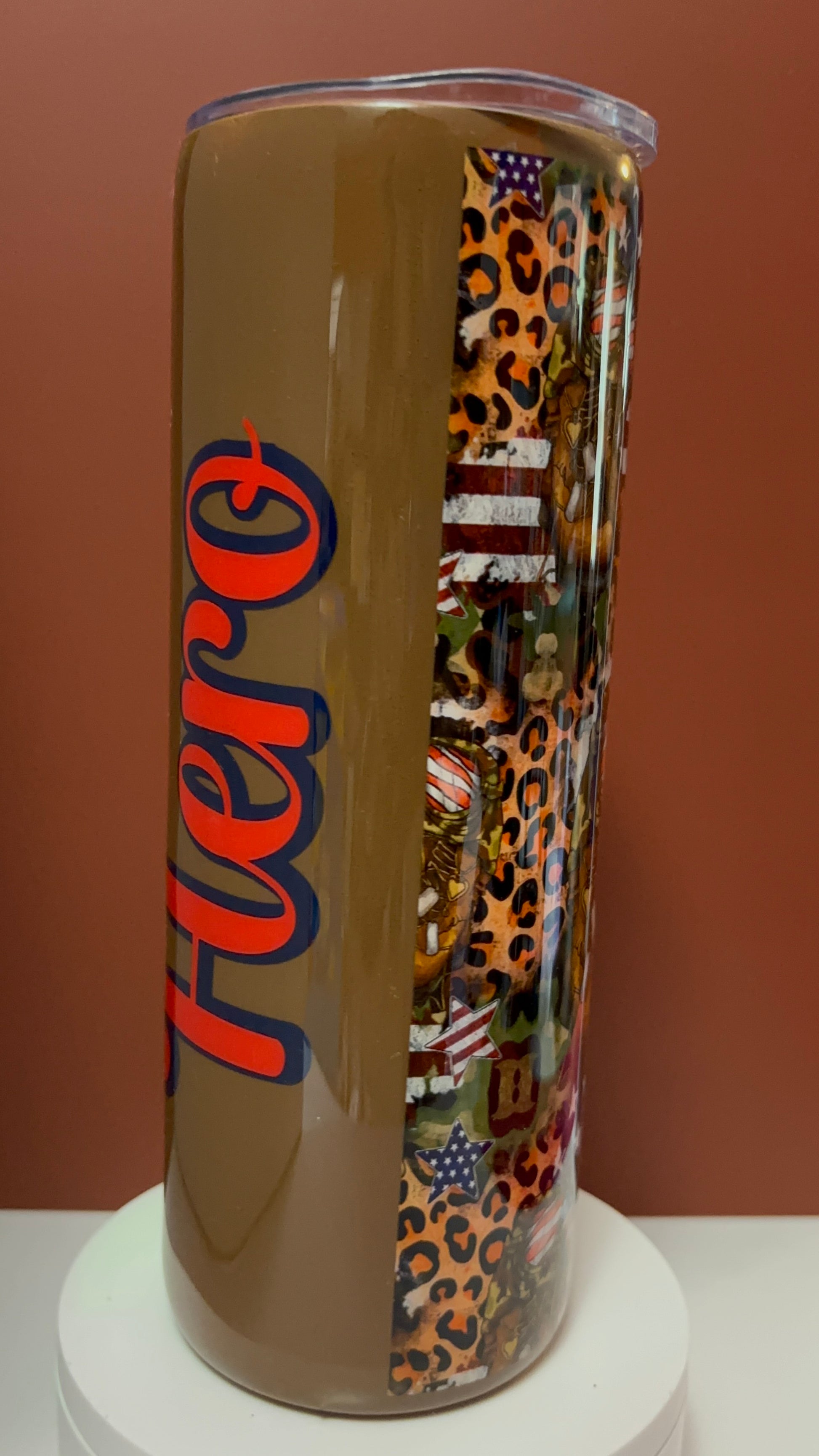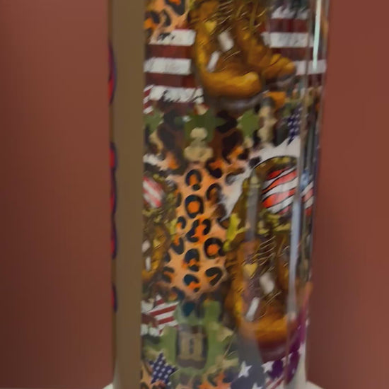 Honor our heroes in style with this stunning handcrafted epoxy tumbler. This one-of-a-kind piece features a bold mix of American flag stars and stripes, military boots, camouflage, and a touch of leopard print for that fierce Irresistible Creation flair. The word “Hero” is beautifully displayed in vibrant red and navy blue lettering, standing as a proud tribute to those who serve.