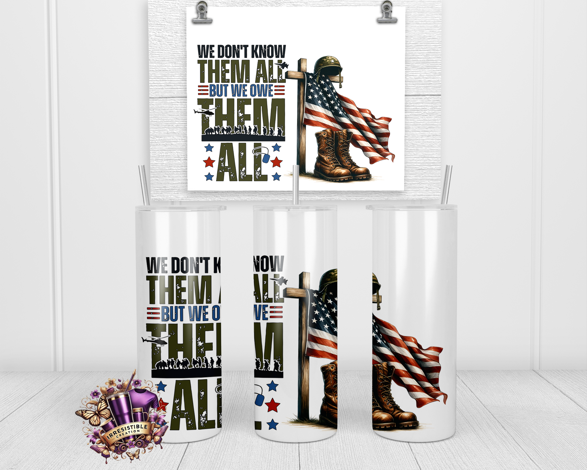 Show your respect and gratitude with our "We Don’t Know Them All, But We Owe Them All" Veterans Tribute Tumblers. Featuring a striking patriotic design with military boots, helmet, and an American flag, these tumblers are a tribute to the brave souls who serve and protect our freedom. Ideal for honoring veterans, active-duty military members, or any patriotic individual, these tumblers keep drinks hot or cold on the go.